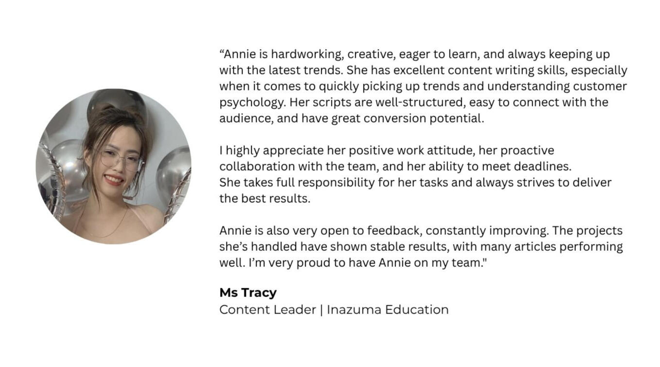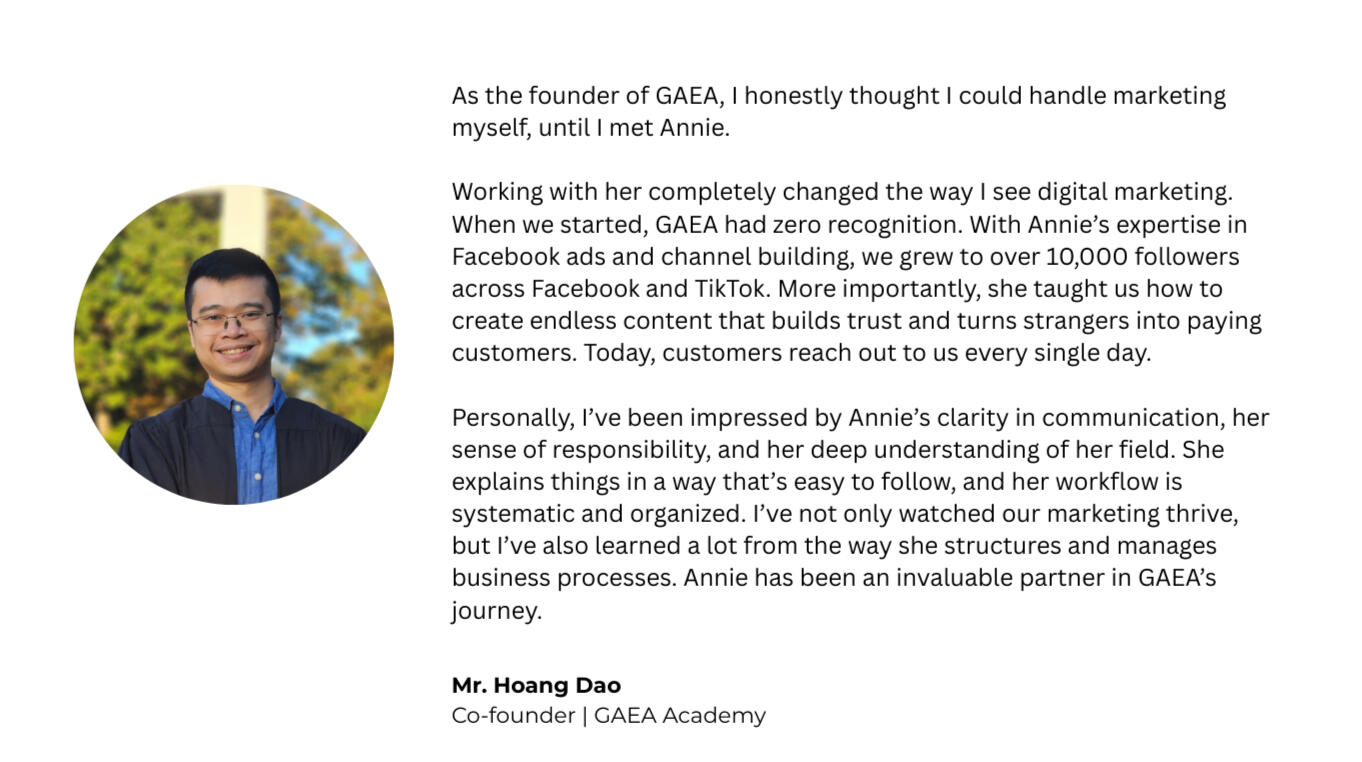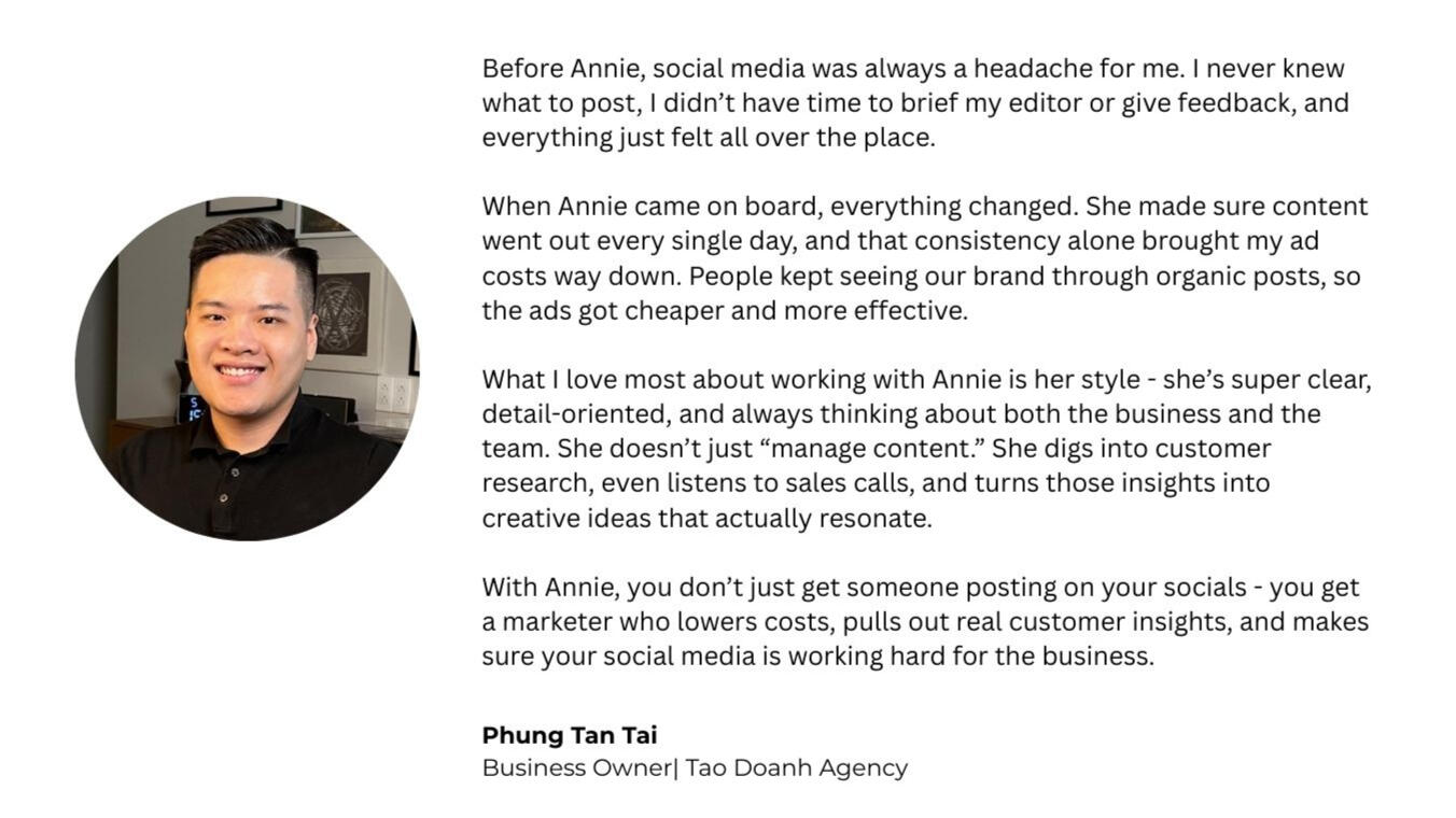 Hey, I’m Annie.Look, I know how hard it is to find a copywriter who just gets it.Someone who can take a brief, turn it into sharp, usable copy, and actually deliver it on time – without the endless back-and-forth.That’s exactly what I do.Here’s how it works:#1: You send me a brief.#2: I send you sharp, on-brand, on-time copy.#3: If you’re happy, we keep working together. If not, no hard feelings.And here’s the best part:We’ll start with a small project.If the copy sucks, you don’t even have to pay me.If it works, we keep going.